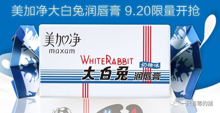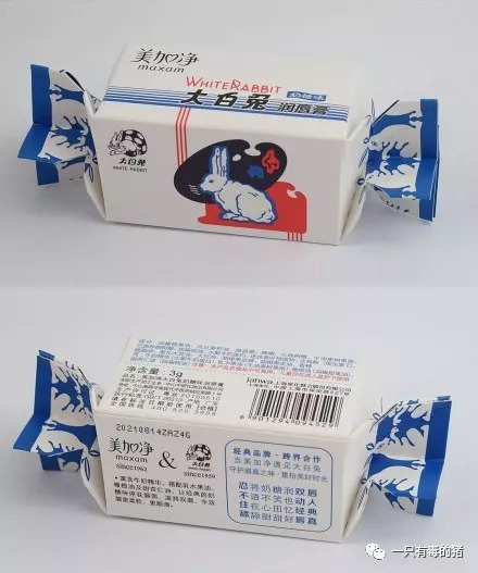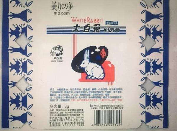 大白兔奶糖味唇膏的消息最早在微博上传开。从微博上的图片看,这款唇膏包装和大白兔奶糖几乎一模一样,只是在包装左上角加上了美加净的标志,在大白兔中文名旁边,两行小字写着“奶糖味润唇膏”。